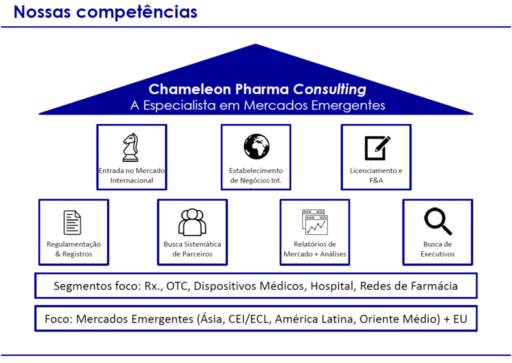 Nós da Chameleon Pharma Consulting oferecemos a nossos clientes uma gama única de Serviços de Consultoria de Saúde em Entrada de Mercado, comoem Estratégia e Marketing, Estabelecimento de Negócios Internacionais, Licenciamento e M&A, Regulamentação e Registro, Publicações, Busca de Executivos, e muito mais. Nossas principais áreas de especialização estão dentro dos segmentos de Pharma, OTC, Dispositivos Médicos, Suplementos Alimentares e Cosméticos, e a maioria dos projetos de nossos clientes ocorre na América Latina, Ásia, EUA/Canadá, Rússia/CEI, Europa e Oriente Médio.